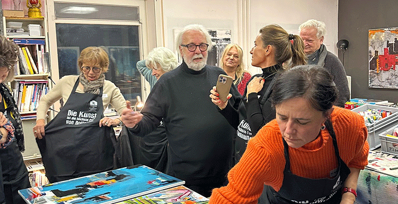 Nach einer kurzen Begrüßung wurde das reichhaltige Sushi-Buffet eröffnet, das für das leibliche Wohl aller sorgte. Es herrschte eine lockere und herzliche Stimmung, und bei köstlichem Essen kamen junge und weniger junge Altschülerinnen und Altschüler ins Gespräch, tauschten Erinnerungen aus und knüpften neue Kontakte. Als alle gestärkt waren, lud Matthias die Anwesenden in sein Atelier ein, wo bereits zwei große Leinwände vorbereitet waren. In einer kreativen Gemeinschaftsaktion entstand dort ein buntes und lebendiges Kunstwerk, das durch die Beiträge aller Gäste eine ganz besondere Dynamik entwickelte. Dieses Gemeinschaftswerk wird bei nächster Gelegenheit ins LSH transportiert und soll dort für einen guten Zweck versteigert werden – eine wunderbare Erinnerung an diesen inspirierenden Abend!