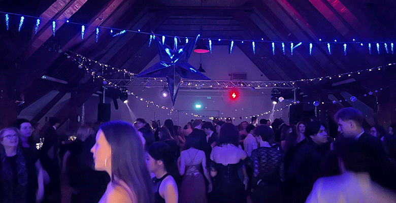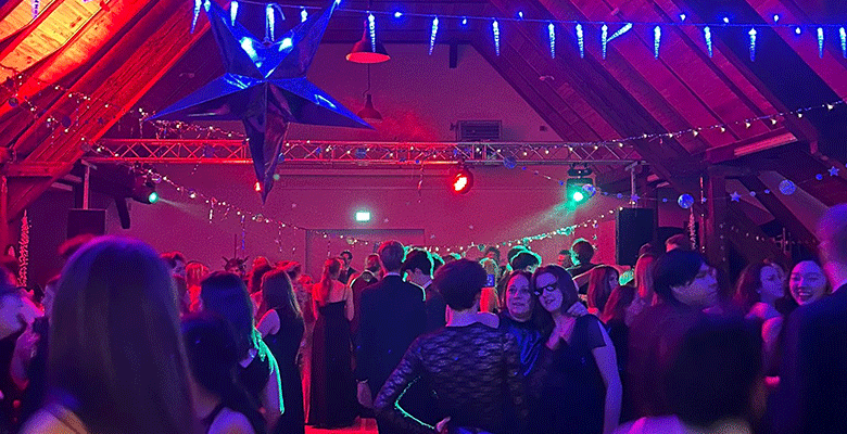 Im Oberhaus begann anschließend der Weihnachtsball, wie immer liebevoll organisiert von Schülerinnen und Schülern unter der Leitung von Anna Weil und dem neu eingerichteten Sozialen Dienst „Feste und Feiern“. Durch einen funkelnden Lametta-Vorhang betrat man die glitzernd geschmückte Kleine Sporthalle, die sich in einen Ballsaal verwandelt hatte, der mit Sternen und Lichterketten eine ganz besondere Atmosphäre bot. Spieleklassiker wie die „Reise nach Jerusalem“ und der legendäre Knotentanz-Wettbewerb sorgten für ausgelassene Stimmung auf der Tanzfläche, die sich bis Mitternacht nicht leerte. Wer zwischendurch eine Pause brauchte, hatte in der Fotobox – ermöglicht durch die Unterstützung des LSH-Bunds – viel Spaß.