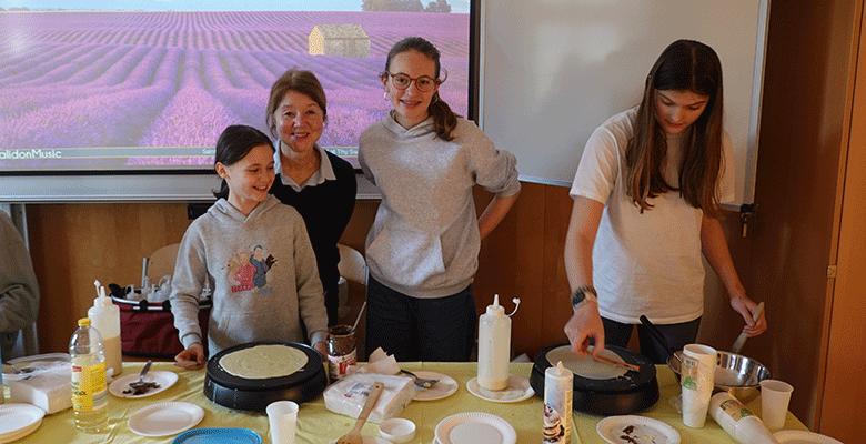 Die Veranstaltung war sehr gut besucht – nicht zuletzt wegen des verlockenden Duftes frisch gebackener Crêpes, der sich im Unterhausflur ausbreitete und direkt in den Klassenraum UH 6 führte. Dort gab es außerdem feine Madeleines sowie drei fachschaftseigene Crêpesplatten, die ununterbrochen im Einsatz waren. Schülerinnen und Schüler der 6. Klasse ebenso wie ältere Jahrgänge entwickelten sich schnell zu ausgezeichneten Crêpes-Bäckerinnen und -Bäckern. Echte französische Orangina, Kaffee, Tee und Wasser rundeten das kulinarische Angebot ab.