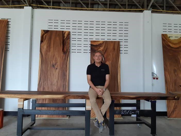 Über den guten Abstand zu vielen Störfaktoren hinaus hat Thailand mir zwei weitere, sehr wichtige Dinge beschert: Zum einen die Entdeckung des Suar-Holzes, dessen faszinierende Optik mich direkt in seinen Bann gezogen hat. Ich war derart schockverliebt in diese massiven Holzplatten, dass ich mir einen Esstisch für mein Esszimmer habe anfertigen lassen. Dieser hat wiederum eine Kettenreaktion hervorgerufen: Anlässlich meines 50. Geburtstages tafelten wir mit Freunden daran. Altschüler und Freund Timo Singer fand den Tisch derart schön, dass er umgehend einen bestellt hat. Weitere Bestellungen folgten und so wurde „Conte Caserta“ geboren. Ich habe 2015 einen Business-Plan erstellt. 2018 standen wir zum ersten Mal auf der Internationalen Möbelmesse Imm Cologne in Köln. Nun, im Jahre 2023, stehen Tische von uns bei Menschen auf der ganzen Welt. Natürlich haben wir auch einige prominente Kunden, die man aus Sport, Film und Presse kennt. Um nur zwei Namen zu nennen: Arnold Schwarzenegger und das schwedische Königshaus speisen an unseren Tafeln, die durchaus auch mal eine Länge von 10 Metern erreichen können.
